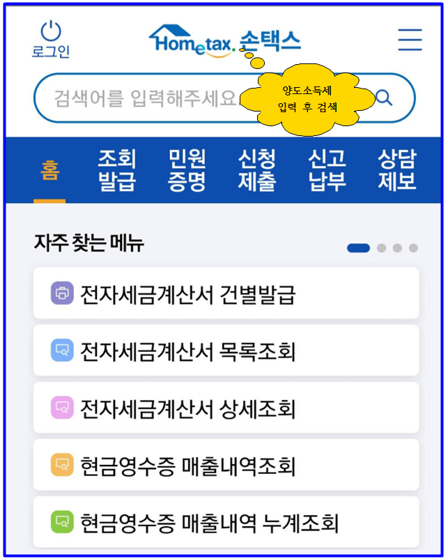 두번째는 모바일에서 계산할 수 있는 양도소득세 자동계산기입니다. 손택스는 홈택스의 모바일용 앱 버전입니다.